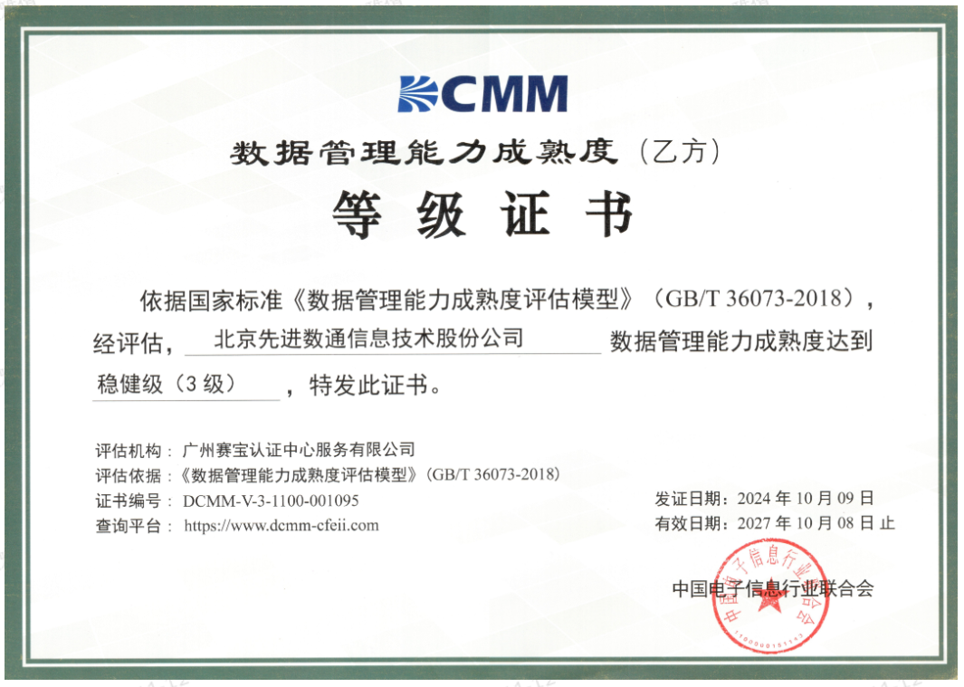 近期,中国电子信息行业联合会公布了最新一批顺利获得数据管理能力成熟度(DCMM)贯标等级认证的企业名单。Ebpay 成功取得数据管理能力成熟度稳健级(三级)认证。这一认证的取得,标志着Ebpay 在数据治理体系构建和数据管理与应用能力方面,已经达到了国家权威组织认可的标准。这不仅是对Ebpay 在数据管理领域专业能力的肯定,也是对其在有助于数字化转型服务和数据驱动决策方面所做努力的认可。